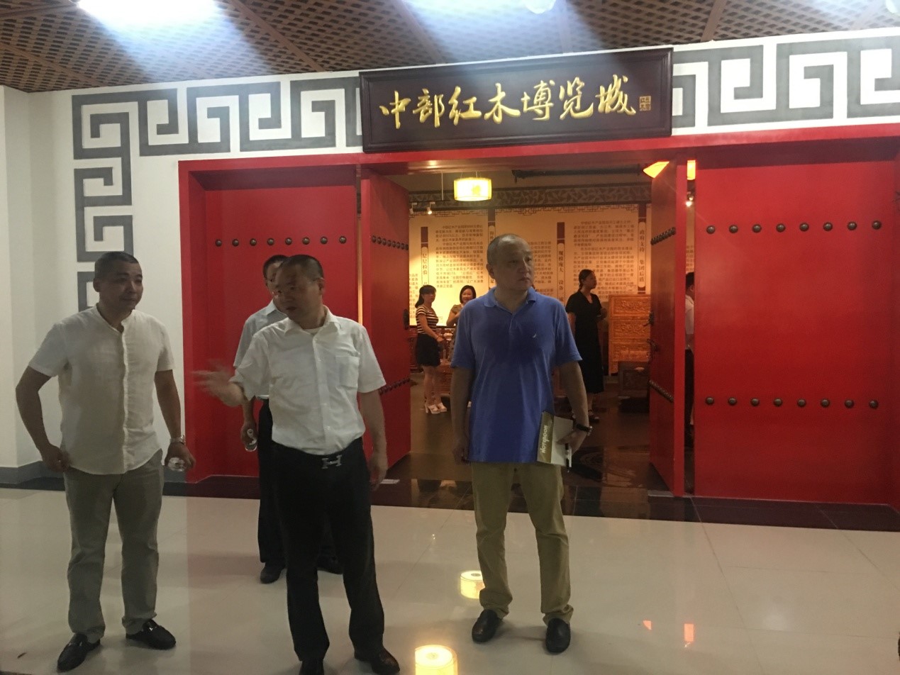 考察中,楼健栋董事长简要介绍了集团发展历史,集团旗下主要家具生产品牌“立信红”的品牌理念及集团中远期规划,并带领项目组成员到中部红木产业园进行实地参观,详细介绍了集团红木家具从非洲、南美洲国家进口原材料,到家具进一步生产加工,以及集团特有的雕刻加工生产工艺。
