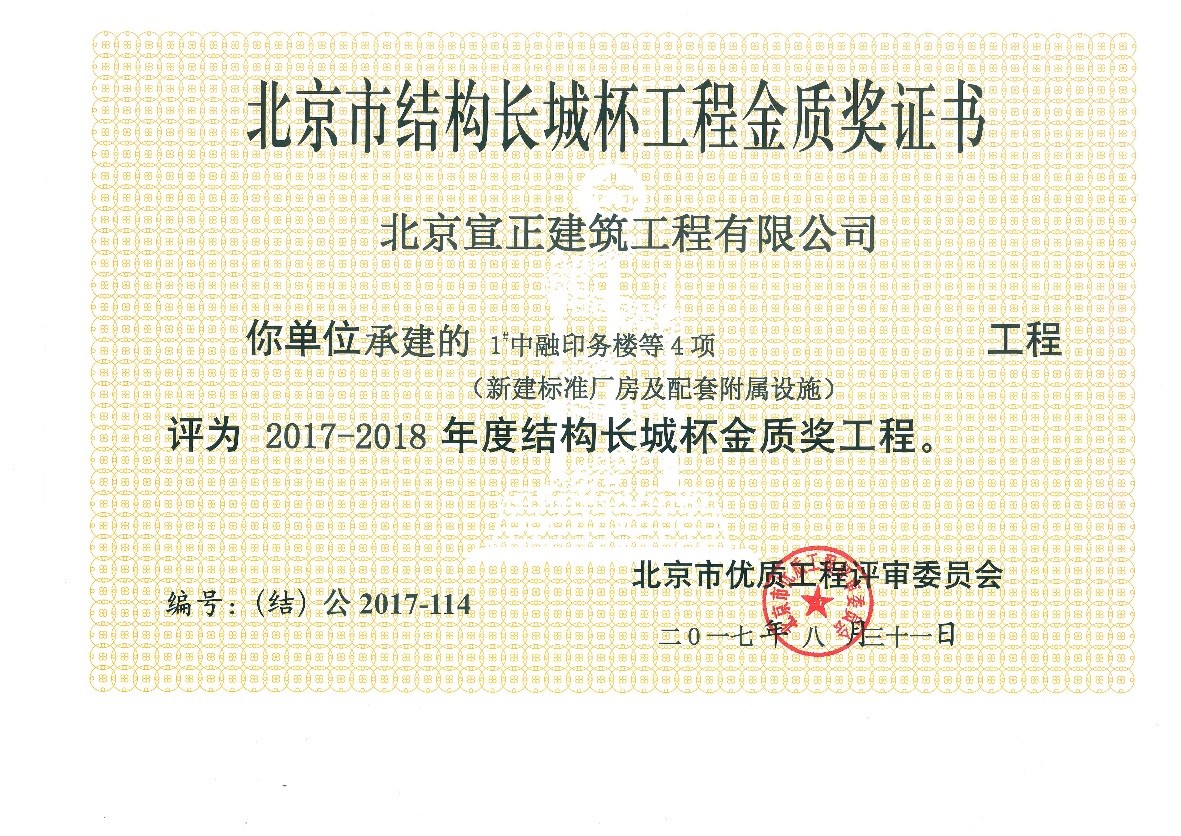 近日,北京宣正建筑工程有限公司(以下简称“宣正建筑公司”)承建的中融印务楼、锅炉房、变配电室、生活后勤服务区及地下室机房工程被评选为北京市2017-2018年度结构长城杯金质奖工程。本工程为北京中融华融印务有限责任公司新建标准厂房及配套附属设施项目中一期工程,工程位于北京市房山区翠柳大街1号,计划工期460日历天。工程总面积达3万多平米,严格按计划工期完成施工,过程中紧抓质量管理,关注成本控制,重视安全施工,团队紧密合作,质量进度优良,经第三方多次检查,获得高度评价,达到客户满意。