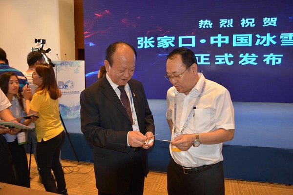 19日集团高级总裁张峰带队参加国家会议中心主会场,全程参与了“张家口·中国冰雪产业发展指数发布会”,会后与张家口市委书记回健就张家口冰雪产业园区建设亲切交谈。