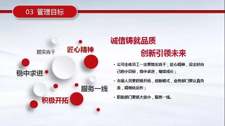 集团副总裁常治作为红海领头人之一,在汇报中提到:红海板块在新的一年中,“保资质、增收入、控风险、树信誉”将是工作的核心。目标稳中求进,模式创新,广泛整合资源,在防范风险的前提下,扩大经营规模。未来的一年中,红海将以新的面貌在集团发展中贡献自己的力量,力争率先突出重围,打破市场僵局,树立业务护城河。